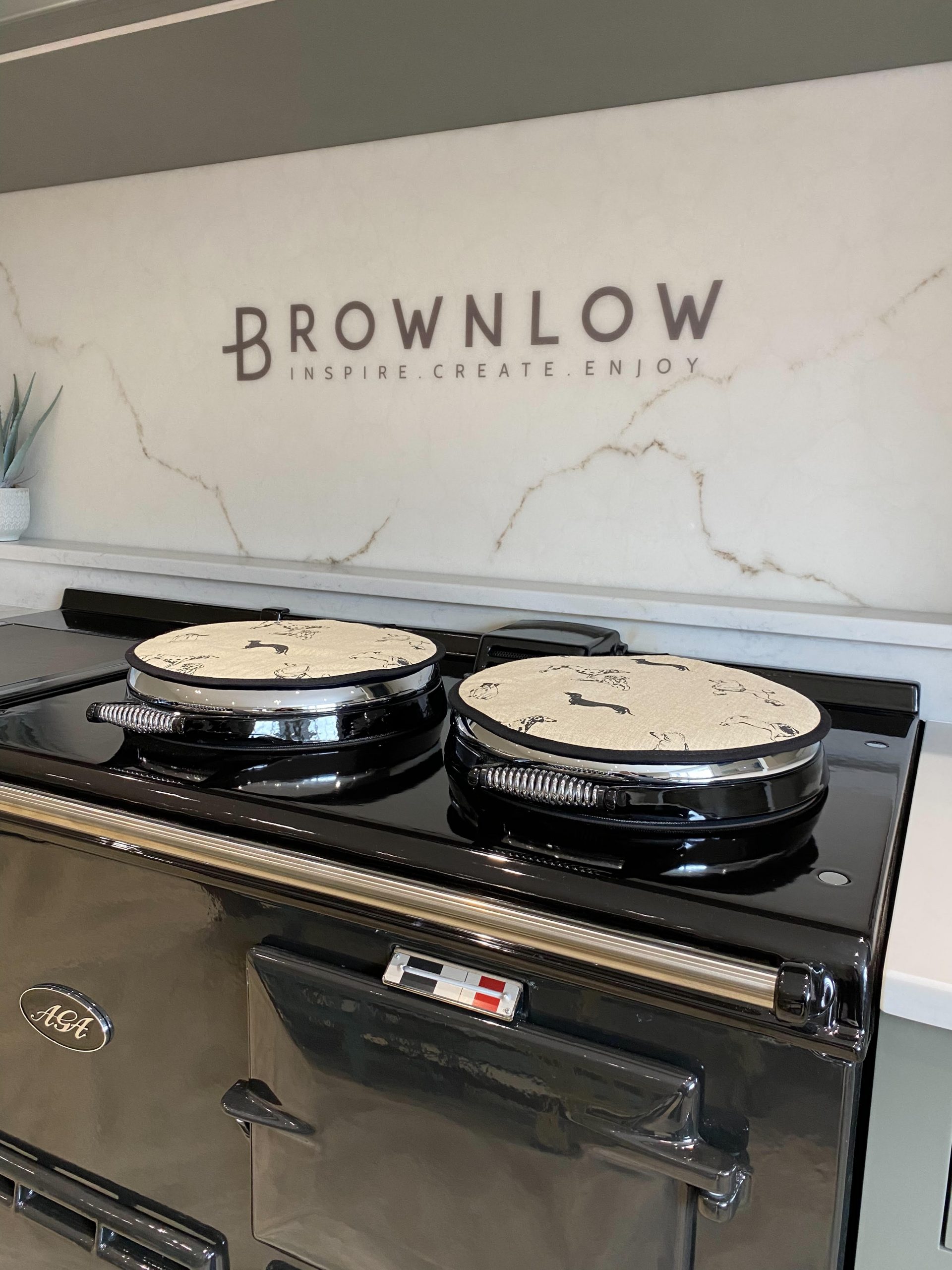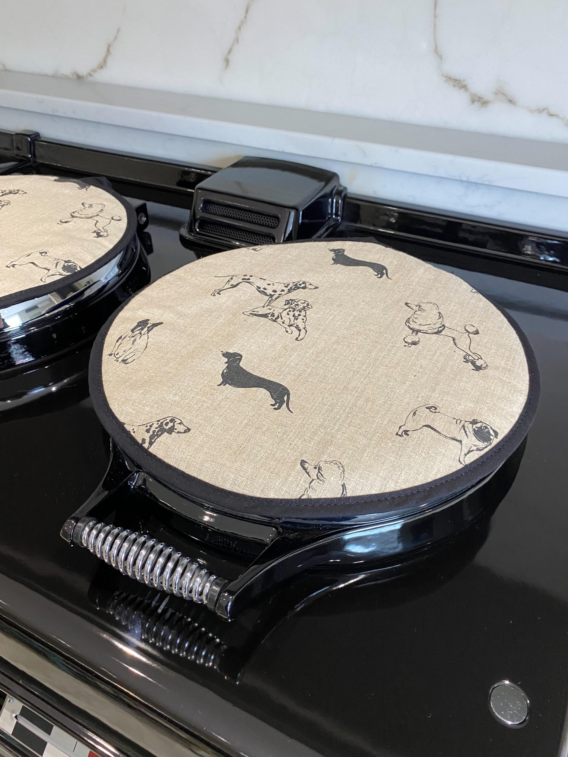 Pooches Noir dog Aga chef pads designed by Clarke and Clark featuring quirky dog pattern